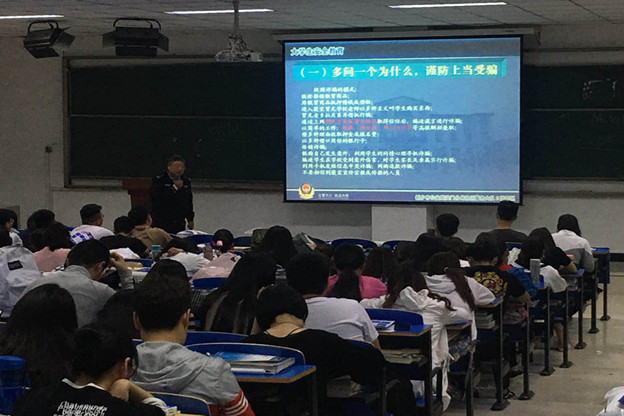 4月20日晚上7点,问学楼101教室座无虚席。民警窦永广详细讲述了电信诈骗的概念、种类、特点,新乡市及驻新高校案发现状,当前反电信诈骗面临的严峻形势,常见的诈骗手法及防范对策等内容,通过列举详实生动的案例,深刻剖析了受骗成因,为同学们上了一堂生动的安全辅导课。期间,支队民警与现场师生就如何摸准受骗人员心理开展干预教育、能否提高支付宝等网络支付工具安全度、如何改进宣传教育方式等问题进行了互动交流,有效提高了同学们对防范电信诈骗的关注度和教育效果。 |