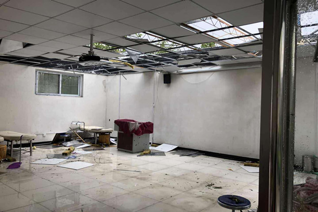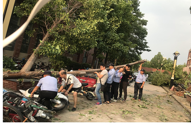 6月13日下午,新乡市遭遇雷暴大风,局地大暴雨,局地冰雹等强对流天气。强风暴雨造成新乡医学院三全学院新乡校区多处道路出现严重积水,问学楼南侧6棵楸树连根拔起倒坍在地,371实习基地美容实验室房顶严重破损,校区和371实习基地多处玻璃门破损,给学院正常的教学秩序和师生员工的生活、学习造成极大的影响。 灾情出现后,翟忠胜主任立即主持召开雨后抢险工作会议,及时向学院通报了新乡校区和371实习基地受暴雨影响的校园情况,并对雨后抢险工作做了具体部署。 新乡综合办全体同志第一时间疏通校园多处积水使积水消退;同时迅速清理道路排涝后遗留下的淤泥,清运各种垃圾,消除积水带来的影响,为学院师生正常出行提供便利。随后邀请三全学院绿化顾问冯建庄老师亲临秋树倒坍现场,指导新乡校区绿化工作人员如何进行科学栽植提升树木的存活率,尽可能为学院挽回经济损失。新乡综合办第一时间联系学院基建部郑伟老师亲临现场,为配合新乡校区和371实习基地暴风雨后抢修工作做好备案。
