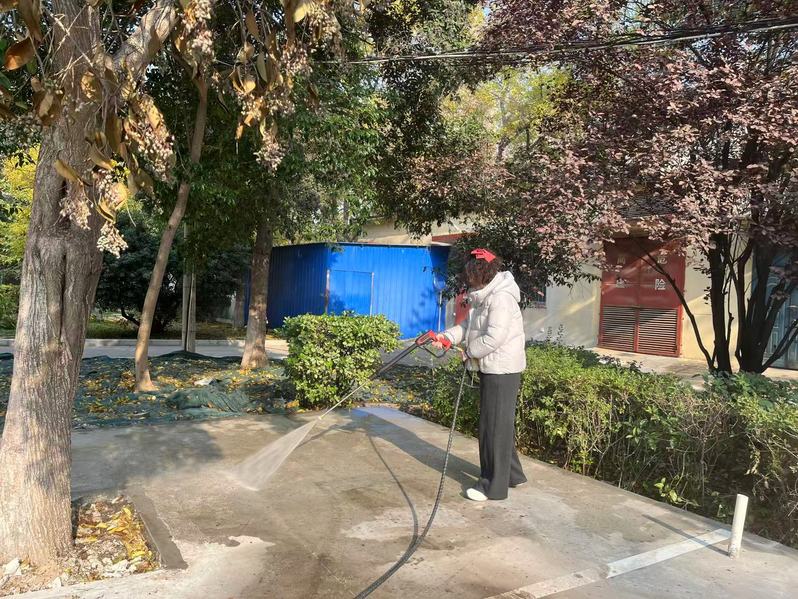 此次专项行动紧扣“全覆盖、无盲区、零容忍”原则,管理处精心部署、统筹推进,组织工作人员与师生志愿者组成专项清理队伍,对校园内易被忽视的卫生难点区域进行集中整治。大家分工协作、默契配合,重点针对绿化带杂物、楼顶、墙角缝隙积尘、公共区域边角、沟渠周边等卫生死角,通过湿扫车、冲洗车、保洁人员手持清洁工具细致清扫、分类清运,不放过任何一处藏污纳垢的角落。从问学楼、公寓楼周边到校园道路,再到两侧到中心花园、篮球场等区域,新乡校区管理处全体人员齐上阵,不怕脏累,用实干让校园环境焕新颜。