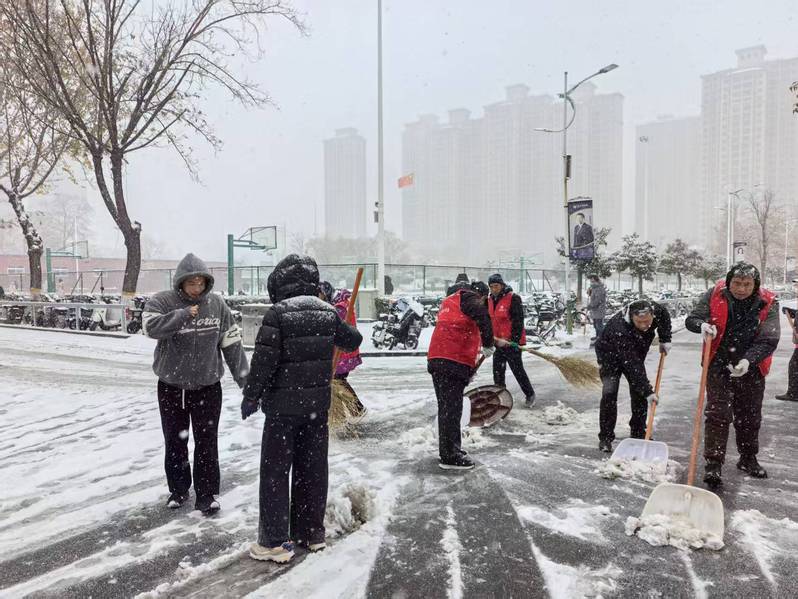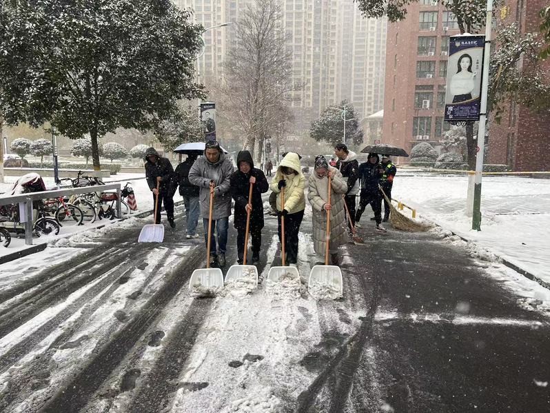 今冬初雪如约而至,漫天飞絮为新乡校区披上银装,却也让校园道路积雪结冰,给师生出行带来安全隐患。新乡校区管理处迅速启动应急响应,以雪为令、闻雪而动,组织保洁人员、保安队员及学生志愿者开展全方位扫雪除冰行动,用责任与暖意守护校园平安。