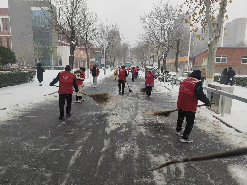 今冬初雪如约而至,漫天飞絮为新乡校区披上银装,却也让校园道路积雪结冰,给师生出行带来安全隐患。新乡校区管理处迅速启动应急响应,以雪为令、闻雪而动,组织保洁人员、保安队员及学生志愿者开展全方位扫雪除冰行动,用责任与暖意守护校园平安。