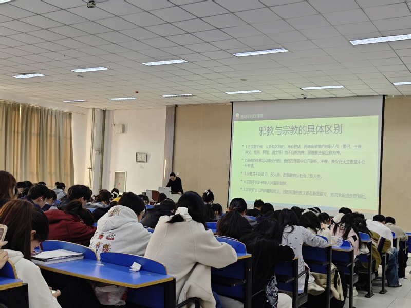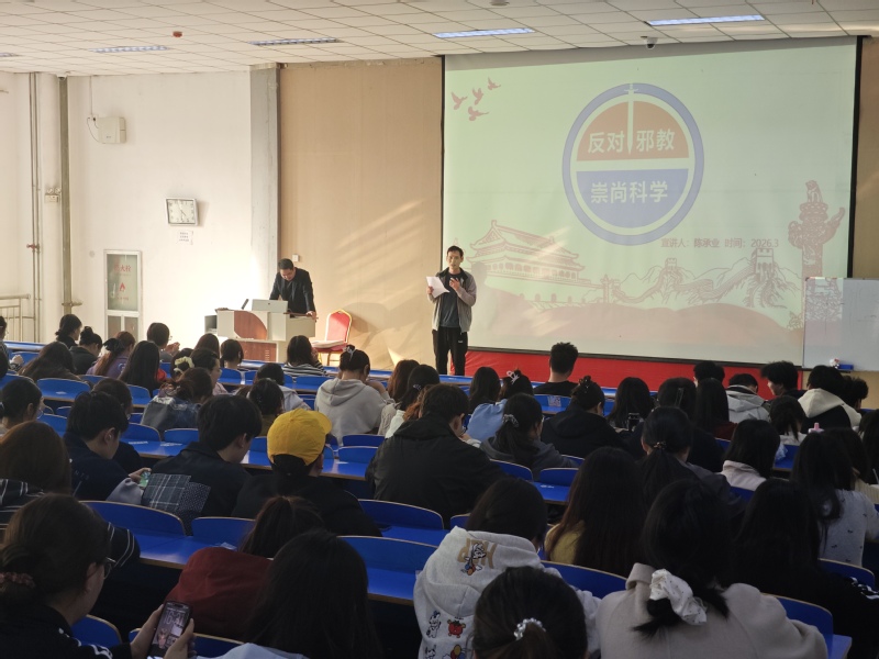 为深入贯彻习近平总书记关于加强国家安全教育的重要指示批示精神,进一步加强反邪教警示宣传工作,教育引导学生认清邪教本质,增强识邪防邪能力,2026年3月27日下午,新乡校区特邀新乡市政法委反邪教协调科陈承业科长,在问学楼2楼T教室开展反邪教安全教育专题讲座。